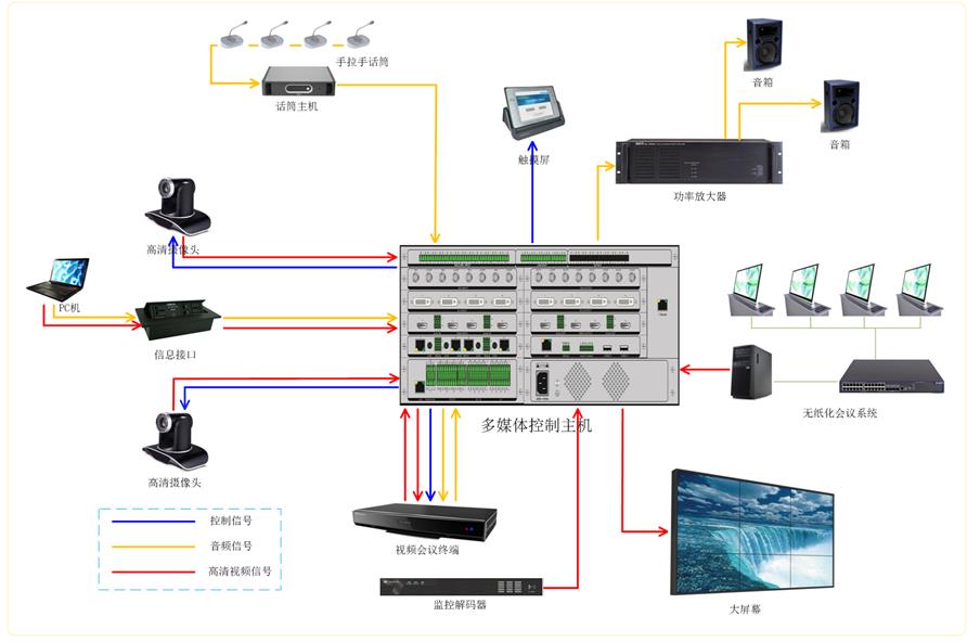 2、多媒体控制系统:采用beats365科技生产的多媒体会议室核心设备----多媒体控制主机,集高清混合矩阵、数字音频处理器、集中控制主机、高清录播服务器于一体。