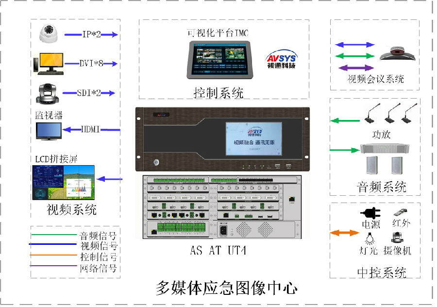 应急中心采用beats365科技自主研发的高度集成综合一体化主机AS-UT4,具备视频矩阵和拼接管理、安防监控管理、音频管理、录制及回放管理、中控外部设备管理、外围视频会议终端和主机自带视频会议双备份管理、可视化综合管理平台管理等功能。项目实现应急中心应急指挥保障、上下级单位视频会议的统一调度与管理。
